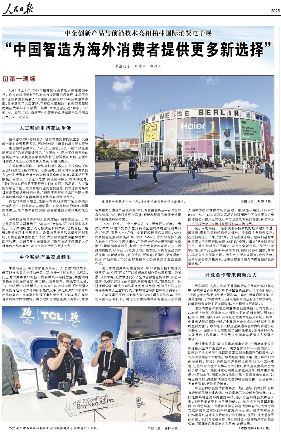 2025年9月9日是IFA落幕日。《人民日報》發表深度通報《中國智造為海外消費者提供更多新選擇(第一現場)》。